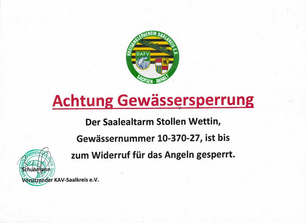 Vom Anglerverein Bitterfeld e. V. kam am 11.04.2025 die Information, dass für das gesamte rechte Ufer der Mulde und den dazwischen liegenden Flächen bis zu den Deichen von der Landesgrenze Sachsen bis zum Muldestausee ab sofort ein Betretungsverbot besteht!